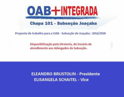 16/11/2015 A nova diretoria da Ordem dos Advogados do Brasil (OAB) da seccional de Joaçaba será conhecida nesta segunda-feira (16). A eleição para escolha dos novos dirigentes teve início as 09h e prosseguirá até as 17h na sede da entidade no edifício Itamaraty, na XV de Novembro. Houve consenso entre [Leia Mais]
