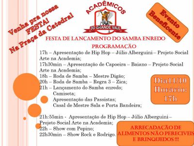10/10/2014 A Escola de Samba Acadêmicos do Grande Vale realiza neste sábado, dia 11, a partir das 15 horas, a Festa de Lançamento do Samba Enredo e da camiseta 2015 da agremiação. O lançamento acontece a partir das 17 horas – na Praça da Catedral - em Joaçaba e tem [Leia Mais]