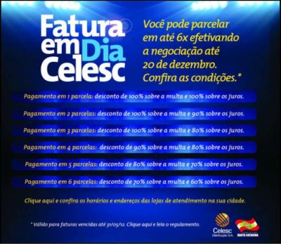 16/10/2012 A CELESC deu início numa operação para recuperação de débitos com foco nas faturas vencidas até o final de maio deste ano. As contas de energia não pagas somam quase R$ 400 milhões e a maioria dos consumidores inadimplentes são as indústrias. A informação é de Alex Santori, advogado [Leia Mais]