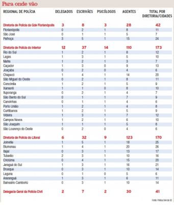27/07/2012 Mais 426 policiais civis serão incorporados à instituição em Santa Catarina no final deste mês. São 23 delegados, 291 agentes, 84 escrivães e 28 psicólogos. As cotas são distribuídas nas diretorias da Grande Florianópolis, Litoral e Interior e uma reserva para a Delegacia Geral, que poderá remanejar os policiais [Leia Mais]