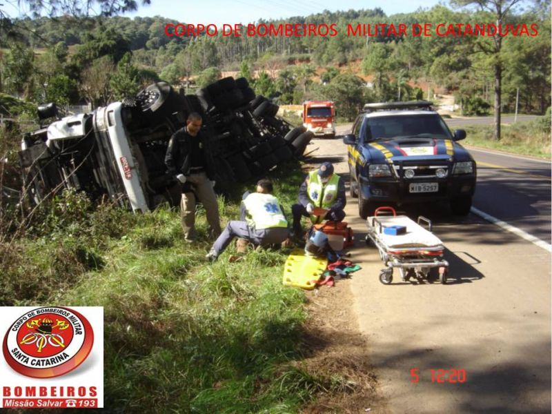 06/07/2012 Um caminhão tombou na manhã desta quinta-feira (05) próximo a Vargem Bonita. O acidente aconteceu por volta das 11h na BR-282. O veículo envolvido, Scania placas de Treze Tílias, era conduzido por um jovem de iniciais S.A., 24 anos. O Corpo de Bombeiros de Catanduvas foi acionado. O motorista estava fora da cabine, consciente e acompanhado da Polícia Rodoviária Federal (PRF). A vítima apresentava suspeita de fratura na perna esquerda, tornozelo, região do fêmur, suspeita de fratura no cotovelo esquerdo, além de diversas escoriações nos braços, pernas e nas costas. Após os procedimentos no local, o motorista foi conduzido ao Hospital Universitário Santa Terezinha (HUST) de Joaçaba.