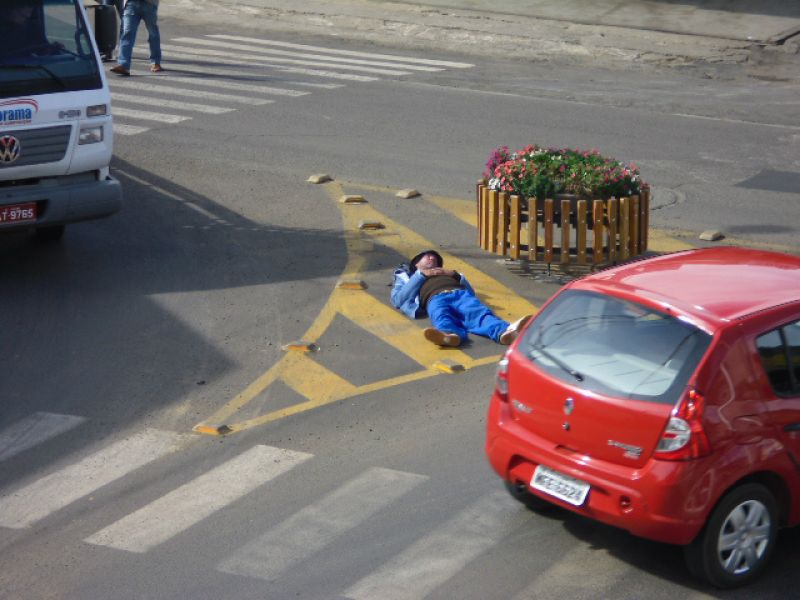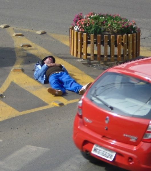 09/07/2012 Motoristas que passaram no início da tarde desta segunda-feira (09) pela avenida Barão do Rio Branco em Joaçaba presenciaram uma cena curiosa. Cansado, um cidadão, mais um personagem do cotidiano da cidade, decidiu tirar uma soneca no canteiro central ao lado de um floreira e no meio de um cruzamento de veículos. Com sono pesado, o homem permaneceu alguns minutos até ser aconselhado a procurar outro local.