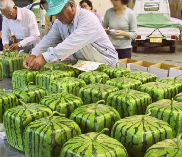31/08/2012 Um agricultor japonês desenvolveu melancias quadradas que já se tornaram populares no Japão. A tecnologia também já está sendo adotada no Brasil. Há 20 anos um agricultou da ilha de Shikoku teve a ideia de dar formas mais retas às frutas para que elas pudessem ser guardadas nas geladeiras dos consumidores. Além disso, o formato redondo dificultava que se cortasse a melancia. Para mudar o design das frutas os fazendeiros as cultivaram dentro de caixas. Desse modo, naturalmente, a melancia adotou o formato da caixa. Na região de Joaçaba já existem empresários sondando fornecedores para disponibilizar o produto à população. O que está inviabilizando a chegada desta novidade em nossa região é o preço.