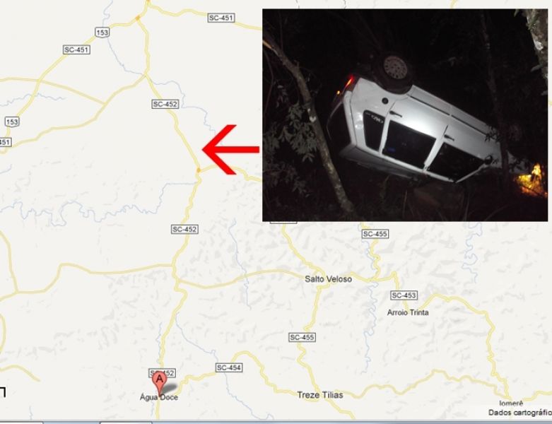 03/11/2012 Um jovem de 29 anos perdeu a vida num acidente de trânsito na noite desta sexta-feira (02) na SC-452 em Água Doce. Foi uma saída de pista seguida de capotamento na comunidade de Nova Vicenza. Carlos Augusto Bento, 29 anos, morador de Treze Tílias, perdeu o controle do Fiat Uno Mille, placas LYA 1107, de Treze Tílias, saiu da pista e capotou. O caroneiro Lucimar de Oliveira, 24 anos, escapou com vida com escoriações e cortes na cabeça e também na perna direita.
