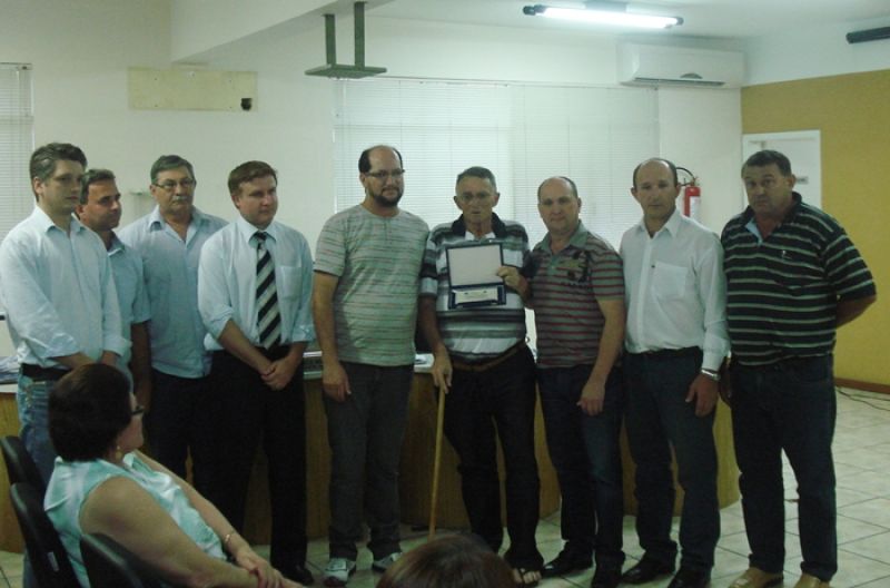 07/11/2012 Casa cheia e sessão marcada por muita emoção durante a entrega da placa de Título de Cidadão Honorário ao ex-prefeito Remi Alécio Mascarello. Familiares e amigos compareceram em peso a sessão de terça-feira (6) para prestigiar o ex-prefeito que recebeu a honraria aprovada por unanimidade pelo Legislativo hervalense e de autoria do vereador Joner Miguelão (PMDB).O Projeto de Decreto Legislativo nº044/2012 visa prestar homenagem e reconhecimento aos serviços prestados por Mascarello ao município de Herval d’Oeste.