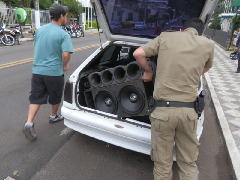 23/11/2012 A Polícia Militar realizou na manhã desta sexta-feira (23) a apreensão de equipamentos de som de um veículo que estava perturbando o sossego público. A ocorrência foi registrada na rua Tiradentes, bem próximo da Delegacia Regional de Polícia. O condutor de um Kadett, placas de Joaçaba, chegou para trabalhar com o volume do som acima do normal, chamando a atenção de toda vizinhança e até dos policiais que estavam na delegacia. O jovem de 20 anos, iniciais L.P.S, foi abordado e teve o equipamento apreendido, inclusive ajudando os PMs transportar as caixas de som até a delegacia de polícia. Durante verificação de documentos foi constatado que o carro estava com o licenciamento atrasado. Além de multa pela falta de licenciamento, o jovem vai responder um Termo Circunstanciado (TC).