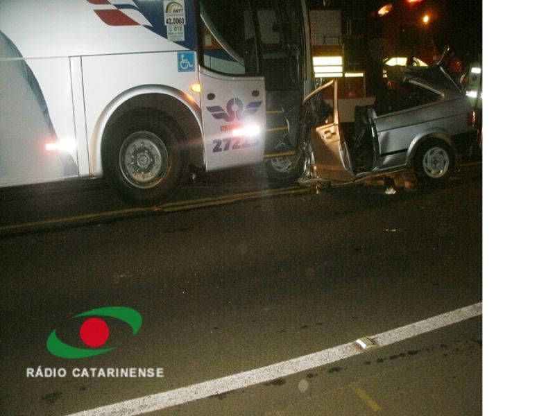 07/12/2012 Um homem morreu na madrugada desta sexta-feira (07) no km 356 da BR-282 em Erval Velho. O acidente aconteceu por volta da 1h30. Colisão frontal entre um ônibus da empresa Reunidas placas MGP-1191 de Caçador, que fazia sentido Florianópolis/Joaçaba, e um VW/Gol placas AED-5774 de Campos Novos, conduzido por Cláudio Alessandro Barbosa, de 28 anos, natural de Campos Novos. Segundo testemunhas, o carro se deslocava sentido Erval Velho/Campos Novos fazendo zigue-zague na pista quando o motorista perdeu o controle, invadiu a pista contrária e bateu de frente com o ônibus. Cláudio Alessandro Barbosa foi socorrido pelo SAMU, mas morreu a caminho do Hospital Universitário Santa Terezinha (HUST) de Joaçaba, nas proximidades da ponte Alfredo Ítalo Remor. O corpo da vítima foi encaminhado ao IML de Joaçaba. Nenhum dos ocupantes do ônibus se feriu. Um laudo da PRF deverá apontar as causas do acidente.