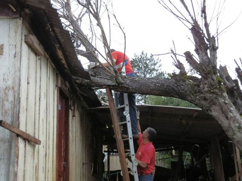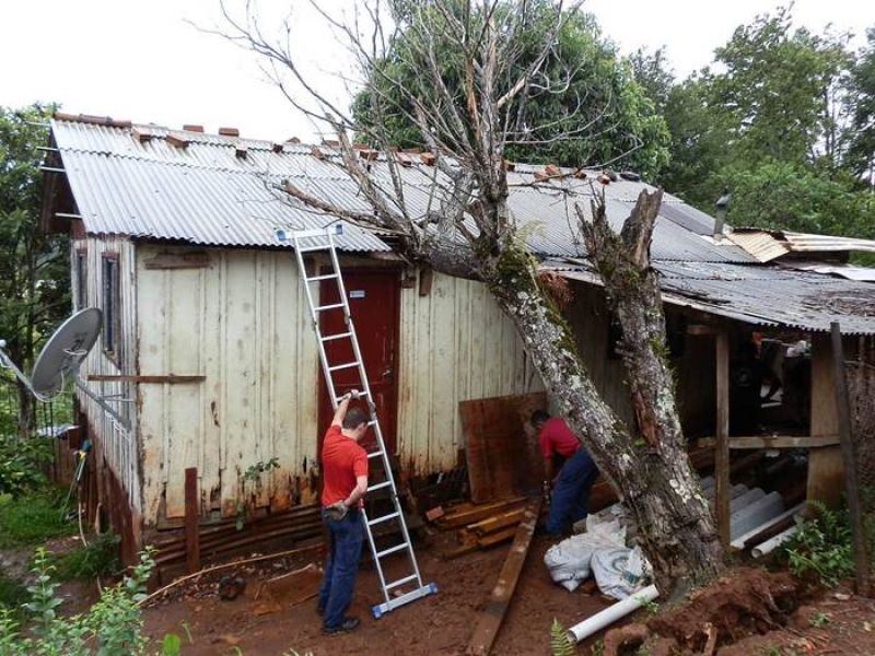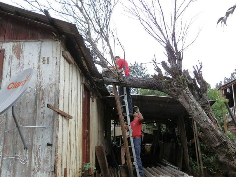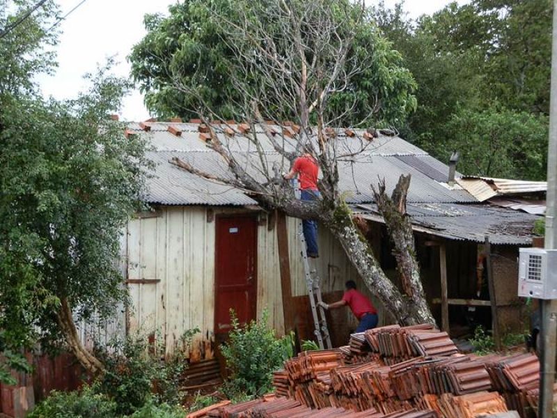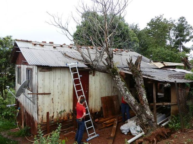 21/12/2012 Moradores de um bairro de Joaçaba levaram um susto na tarde desta sexta-feira (21) depois que uma árvore caiu sobre a casa em que eles residem. O fato foi registrado por volta das 14h30 na rua José Cardoso, bairro Jardim das Hortências. A árvore danificou grande parte do telhado da residência de madeira, de propriedade de Sirlei de Almeida, de 40 anos. Chovia no momento da queda. Os bombeiros tiveram dificuldade de chegar com o caminhão ao local devido às más condições da estrada de terra, que estava escorregadia. Eles retiraram os galhos e em seguida serraram o tronco. Foi necessário providenciar rapidamente a reposição de telhas para evitar que a chuva não invadisse o imóvel. Ninguém se feriu.