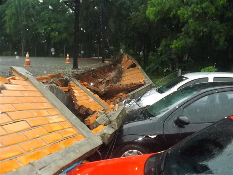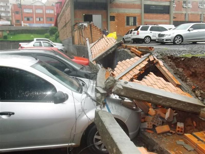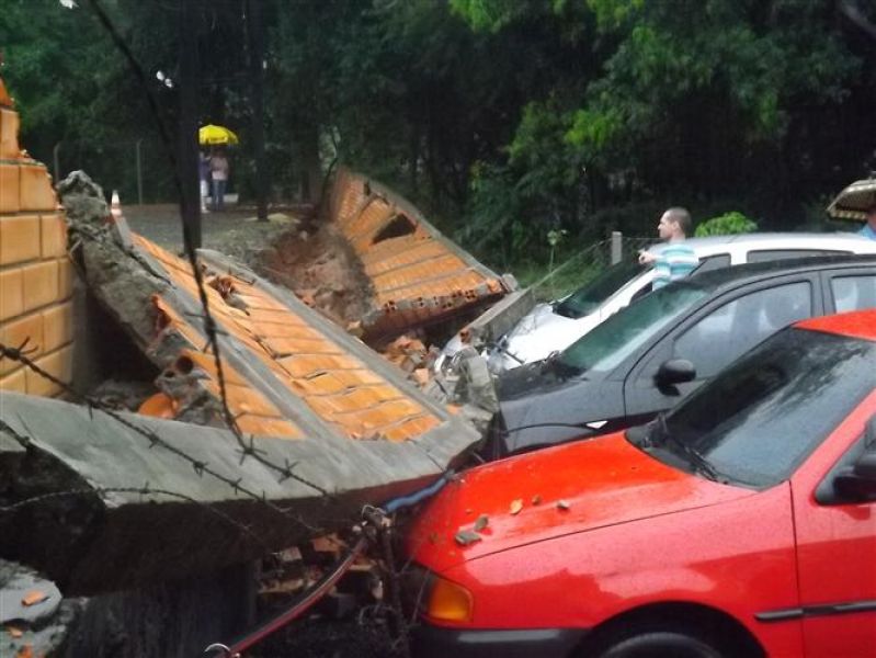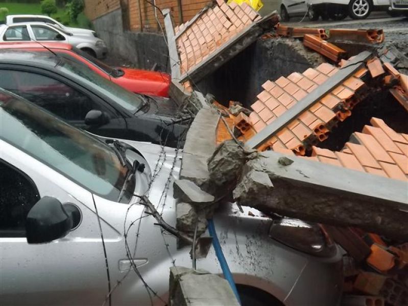 27/12/2012 Três veículos foram atingidos por um muro que desabou na tarde desta quinta-feira (27) em Joaçaba. O fato foi registrado por volta das 16h no estacionamento de um restaurante localizado na avenida Santa Terezinha, nas proximidades do Hospital São Miguel. Os escombros do muro de dois metros de altura por 20 de comprimento danificaram um VW/Gol, um Ford Focus e um Renault Sandero, atingindo principalmente o capô dos carros. O proprietário do estabelecimento acionou a perícia de uma seguradora para, com base no levantamento, tomar as providências cabíveis. Ele se comprometeu em reparar os danos nos veículos. A chuva intensa pode ter contribuído para a queda do muro. Polícia Militar, Corpo de Bombeiros e Polícia Civil foram chamados para prestar apoio à ocorrência. Ninguém ficou ferido.