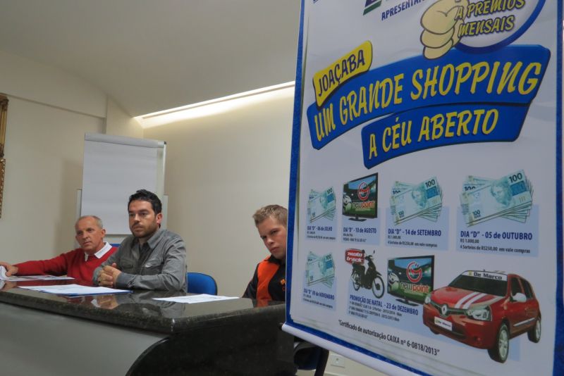 18/06/2013 A Câmara dos Dirigentes Lojistas (CDL) lançou nesta segunda-feira (17) a promoção “Joaçaba Um Grande Shopping a Céu Aberto”. Os detalhes da promoção foram revelados pelo presidente da CDL, Pablo Calluans, durante entrevista coletiva que reuniu jornalistas e profissionais dos principais veículos de comunicação de Joaçaba. De 24 de Junho à 23 de Dezembro serão sorteados R$ 35 mil em prêmios, entre eles uma Moto e um Carro. Os consumidores que comprarem nas lojas que estão aderindo à promoção estarão recebendo cupons para concorrer aos 6 sorteios mensais que acontecerão nos dias 06 de Julho, 10 de Agosto, 14 de Setembro, 05 de Outubro, 09 de Novembro e 23 de Dezembro. A expectativa é que cerca de 200 lojistas participem da promoção que inicia na próxima segunda-feira (24). Serão 16 vales compras de R$ 250,00, 2 TVs de 42”, 1 Moto e 1 Carro. A promoção é da CDL e do Jornal Raízes Diário.