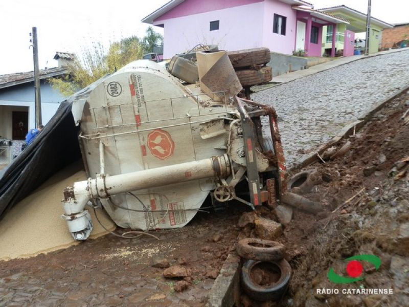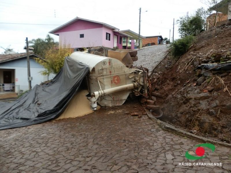 19/06/2013 Um caminhão carregado com 12 toneladas de ração para aves por muito pouco não provocou uma tragédia no bairro Frei Bruno em Joaçaba na manhã desta quarta-feira (19). O caminhão (MYY-8438) com placas de Rio Verde, Goiás, tombou em via pública após tentar subir uma ladeira. O motorista José Valdecir Duarte, 42 anos, relatou a Rádio Catarinense que perdeu o controle do caminhão após o mesmo patinar no calçamento molhado. Mesmo acionando os freios, o caminhão deslizou ladeira abaixo. A única alternativa do motorista foi tentar desviar das casas, manobrando para que o veículo atingisse um barranco. Após colidir contra a encosta o caminhão tombou na pista, interditando a via. Apenas danos materiais foram registrados. Moradores, revoltados, cobraram providências por parte da prefeitura. O caminhão levaria ração para um aviário.
