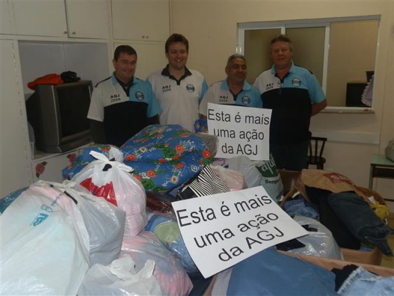 03/07/2013 A Associação dos Gremistas de Joaçaba (AGJ) fez nesta terça-feira (02) mais uma repasse de roupas que foram arrecadadas no projeto “ Triangular da Solidariedade”. A campanha acontece em parceria entre a AGJ, FLAMOESTE e ACOJHOL. Segundo o presidente da AGJ, Leandro Schoemberguer, o “Lolo”, esse foi o segundo repasse feito ao longo da campanha para a Socidedade Obreiros da Luz. Foram entregues 1.228 peças de roupas arrecadadas em diversos pontos. A expectativa, conforme o presidente da AGJ, é de que até o final da campanha que ocorrerá no final deste mês de julho as doações ultrapassem 2 mil peças. A Sociedade Obreiros da Luz, que recebeu os donativos, é a responsável por fazer a separação e distribuição das peças doadas. A distribuição é feita para as famílias que estão cadastradas junto à Rede de Proteção Social do município, que também é parceira da campanha. Até agora mais de 200 famílias já foram atendidas. As doações de roupas para a Campanha do Agasalho do Triangular da Solidariedade prosseguem até o final deste mês nos seguintes pontos de arrecadação: Joauto, Chavemaq, Odontovida, Rhoden Móveis, JK Pneus, Ótica Calliari e Bar Pé de Kaki.