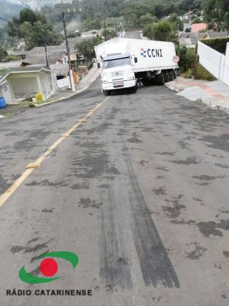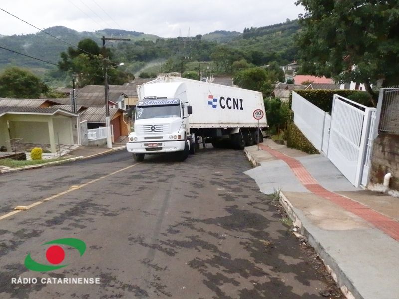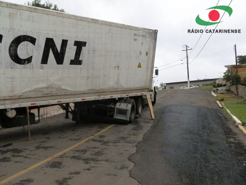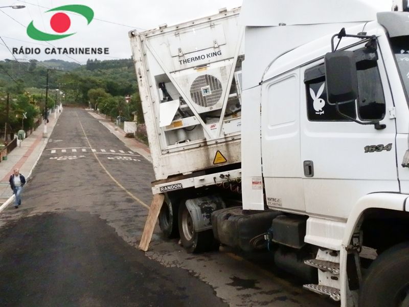 27/03/2012 A carreta que corria risco de tombar na rua Amilton Rossim, bairro Clara Adélia em Joaçaba, foi removida no início da tarde desta terça-feira (27). O motorista, que não conhecia a cidade, entrou na rua por engano na noite desta segunda-feira (26) por volta das 20hs. A carreta com placas de Palmitos (SC) não conseguiu subir um trecho da rua e começou deslizar ficando atravessada na via. Chovia na hora do incidente. O caminhão estava pendido e até escoras de madeira foram usadas na tentativa de evitar o tombamento.