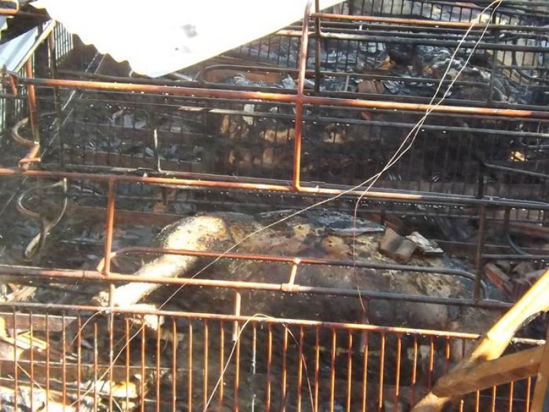 14/11/2013 Um incêndio de grandes proporções destruiu uma pocilga no interior de Joaçaba e matou mais de 60 suínos na tarde desta quinta-feira (14). O fato ocorreu por volta das 16h30 na linha Pato Roxo, próximo a Lacerdópolis, na propriedade de Carlos Chiamolera. Não havia ninguém em casa no momento do incêndio. O proprietário suspeita que o fogo tenha começado em um curto-circuito. Segundo ele, a fiação elétrica era bastante antiga. Mais de 80 leitões em fase de amamentação estavam no local. Alguns foram salvos, mas no total, oito matrizes e mais de 50 leitões morreram carbonizados. O Corpo de Bombeiros utilizou aproximadamente 4 mil litros de água para extinguir as chamas e fazer o rescaldo. Chiamolera estima um prejuízo de mais de R$ 20 mil somente com os animais. O proprietário não possuía seguro, tanto dos animais como da pocilga.