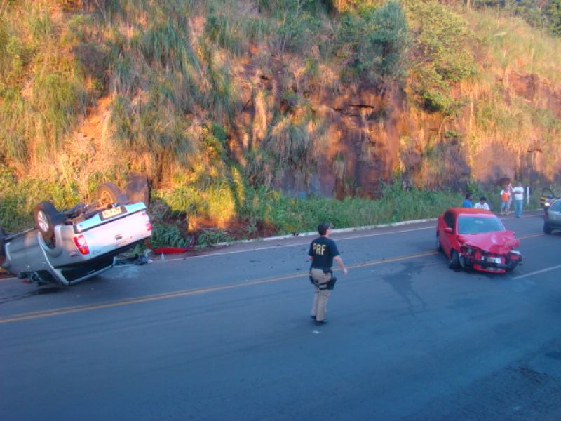 17/11/2013 Três veículos se envolveram em acidente na tarde deste domingo (17) na BR-282 em Herval d’ Oeste. A colisão ocorreu no km 365 por volta das 16h15 nas proximidades da Curva do Passat. Caminhonete Toyota Hillux placas de Xaxim (SC) fazia sentido Joaçaba quando colidiu de frente com o Voyage placas de Chapecó (SC). Atrás do Voyage seguia um Corsa com placas de Xanxerê (SC) que também foi atingido. Segundo as informações do motorista do Voayage, de 53 anos, uma carreta tentava fazer uma ultrapassagem forçada provocando o acidente. Com o impacto a caminhonete que era conduzida por um homem de 53 anos capotou. O Corsa que era dirigido por um homem de 59 anos foi atingido levemente. No Voyage estavam dois homens, na caminhonete quatro pessoas e no Corsa somente o motorista. Um casal que ocupava a caminhonete foi levado pelos bombeiros ao Hospital Universitário Santa Terezinha de Joaçaba com ferimentos na cabeça e nos braços. Os demais envolvidos não se feriram. O acidente deixou uma das pistas obstruída. A Polícia Rodoviária Federal fez a orientação do trânsito e o boletim de ocorrência.