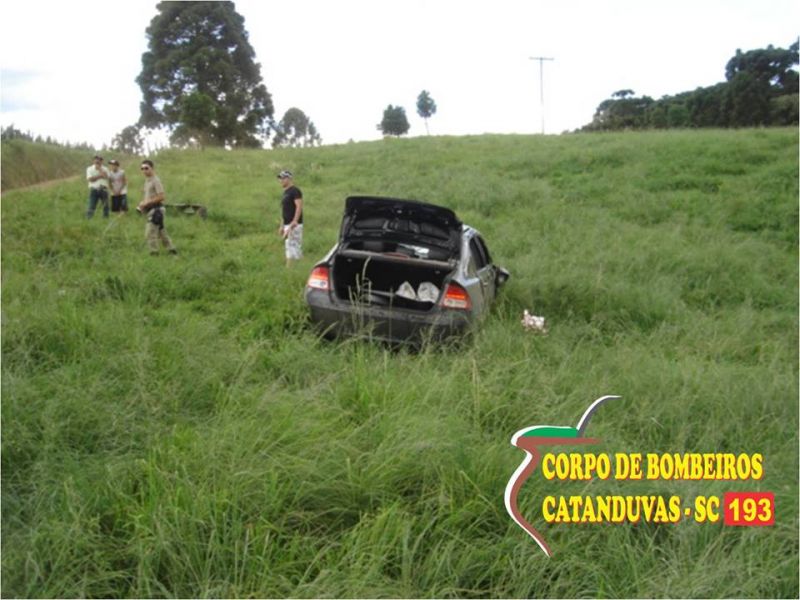 21/12/2013 Um carro capotou na tarde desta sexta-feira (20) em Catanduvas. O acidente ocorreu por volta das 15h45 na comunidade de Linha Pedra Lisa. Um Honda Civic com placas de Balneário Camboriú (SC) saiu da pista e capotou. O Corpo de Bombeiros deslocou ambulância para socorrer as vítimas. Os quatro ocupantes estavam fora do carro. Dois sofreram ferimentos, o condutor de 33 anos e um jovem de 18 anos. O motorista teve escoriações no braço esquerdo e o jovem um corte no joelho esquerdo. Os dois foram conduzidos ao Hospital Universitário Santa Terezinha de Joaçaba. Os danos materiais no carro foram de grande monta. A Polícia Militar também esteve no local para fazer o registro da ocorrência.