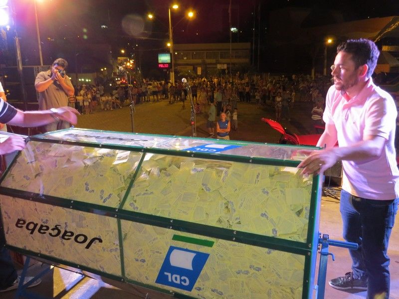 23/12/2013 O sonho de ganhar um carro zero quilômetro, uma moto ou então uma TV de 42 polegadas, habitou o imaginário de milhares de consumidores que efetuaram suas compras nas lojas que aderiram a promoção “Joaçaba Um Grande Shopping a Céu Aberto”. Um sonho que se transformou em realidade para três pessoas que depositaram seus cupons e principalmente esperança nas urnas distribuídas pelo comércio local. Como verdadeiras “agulhas em palheiros”, no meio de quase 1 milhão de cupons, os felizardos emergiram de um mar de papel e foram conhecidos na noite desta segunda-feira (23) durante sorteio realizado na Praça da Catedral. “É muita sorte ganhar um carro zero quilômetro de uma hora para outra” destacou o operário Emanuel Dias, que acompanhou atento ao sorteio ao lado de dois filhos e com esperança de que um dos seus três cupons fosse o sorteado.