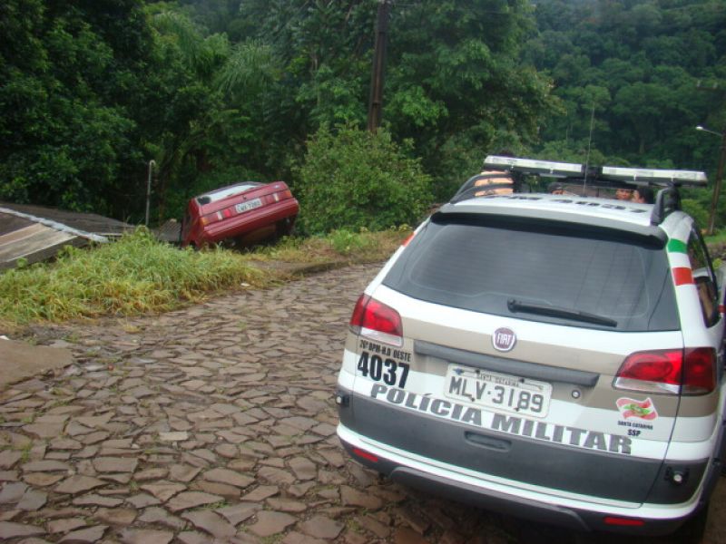 15/01/2014 Moradores de uma residência na rua Ricieri Zamoner, bairro João Paulo II em Joaçaba, tiveram um grande susto na tarde desta quarta-feira (15). Um carro despencou sobre uma residência, por volta das 16h30. O veículo, um Ford Escort placas de Joaçaba foi estacionado na rua pelo proprietário, o vigilante Dorival Cassul de Menezes, de 44 anos. Ele mora no bairro Santa Tereza em Joaçaba e foi visitar um amigo. Logo após ter estacionado o carro, já na casa do amigo, ele foi informado por vizinhos que o veículo havia desandado e caído sobre uma residência. O carro ficou pendurado. Os danos materiais foram maiores na casa que teve uma parede danificada e parte da cobertura dos fundos. Um guincho foi acionado para retirar o Escort. A Polícia Militar fez o levantamento da ocorrência. O soldado Lucas Claro dos Santos informou que a documentação do veículo, bem como do motorista, está em dia. Menezes ressalta que o veículo está com a parte mecânica regular. Ele afirmou não saber o que aconteceu, pois, teria puxado o freio de mão e deixado o carro com marcha engatada. Ninguém se feriu.