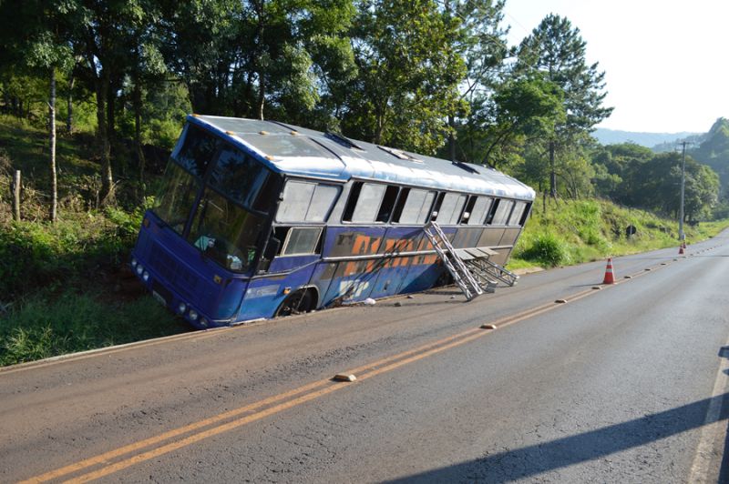 Estruturas metálicas para montagem do palco foram usadas para evitar o tombamento do ônibus que ainda estava no acesso Egídio Pozobom até por volta das 10h da manhã desta segunda-feira (03). O motorista aguardava a chegada de um guincho para fazer a remoção. O ômibus tem placas de Içara (SC) e estava se deslocando que Curitiba para Herval.