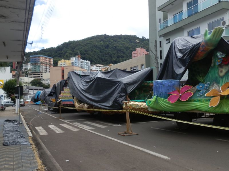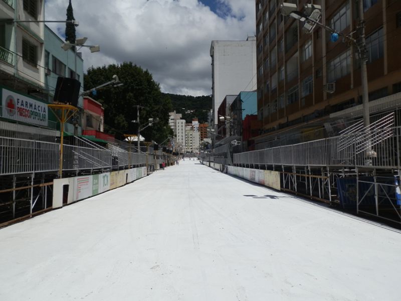 28/02/2014 A XV de Novembro, a principal avenida no coração de Joaçaba, se transformou numa grande passarela por onde vão desfilar quatro Escolas de Samba. A estrutura que toma conta do trecho entre o Hemosc e o Edifício Pedrini foi montada por uma empresa do Paraná. Em razão de normas rígidas de segurança houve uma redução do número de camarotes e também de arquibancadas. O trânsito sofreu alterações significativas por causa da interdição da XV. A PM pede para que os motoristas fiquem atentos e trafeguem com muita paciência observando a sinalização. Os carros alegóricos, que deverão novamente encher os olhos do público, já foram deslocados dos barracões e estão concentrados em vias próximas da passarela do samba.