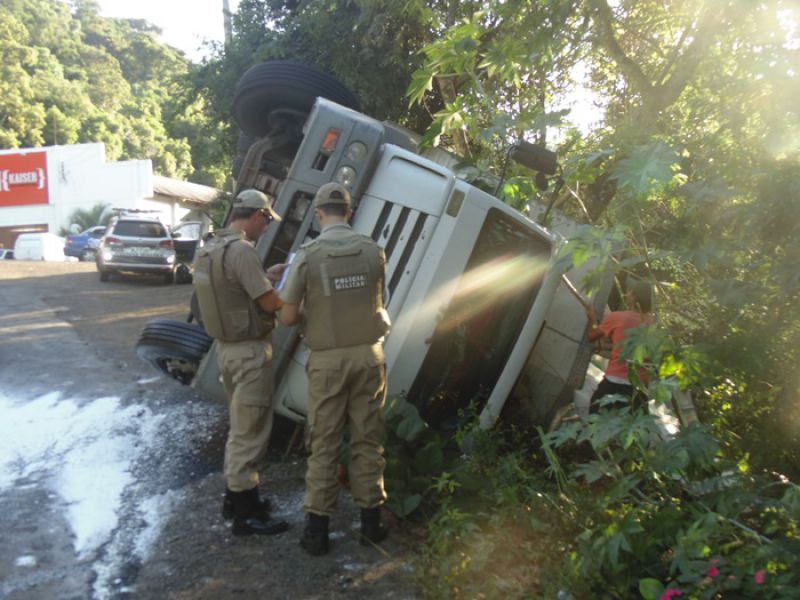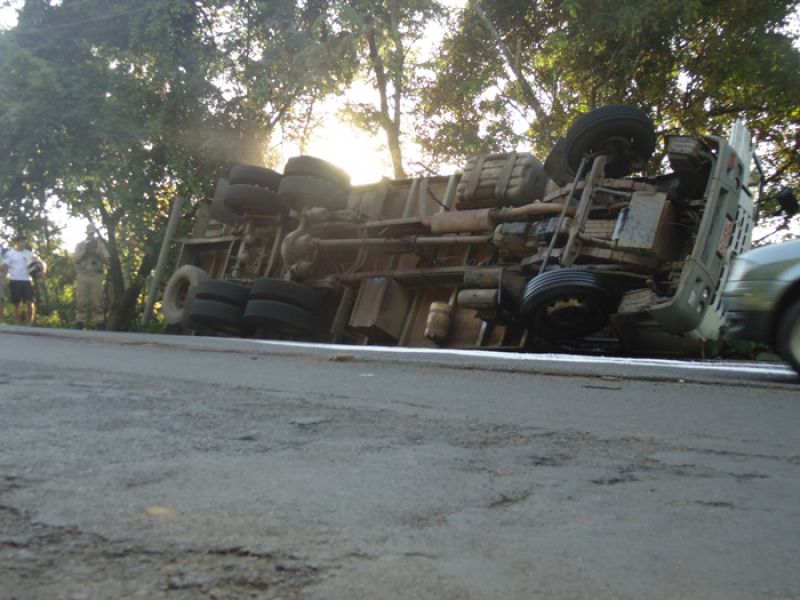 27/03/2014 Um caminhão carregado de sal tombou na tarde desta quinta-feira (27) no acesso Adolfo Zigueli em Joaçaba. O acidente ocorreu por volta das 16h45 em uma curva acentuada em frente a uma distribuidora de bebidas. Volkswagen placas MCY-2941 de Iporã do Oeste descia o acesso em direção ao Centro da cidade quando o motorista, Cléberson Zanchetti, de 22 anos, acabou perdendo o controle da direção. Segundo ele o caminhão ficou sem freio. O caminhão ficou fora da pista, apenas com parte da traseira no acostamento, não oferecendo risco aos usuários da via. A Polícia Militar sinalizou o local. Zanchetti sentia dores no joelho, e dispensou o atendimento no hospital. O Corpo de Bombeiros foi acionado para jogar cal na pista sobre o óleo que vazou do caminhão. De acordo com o soldado Fernando César, a documentação do caminhão e a carteira de habilitação do motorista estão em dia. Parte da carga caiu do baú. O restante deverá ser transferido para outro caminhão. A remoção do caminhão será feita por um guincho da seguradora da cidade de Chapecó.