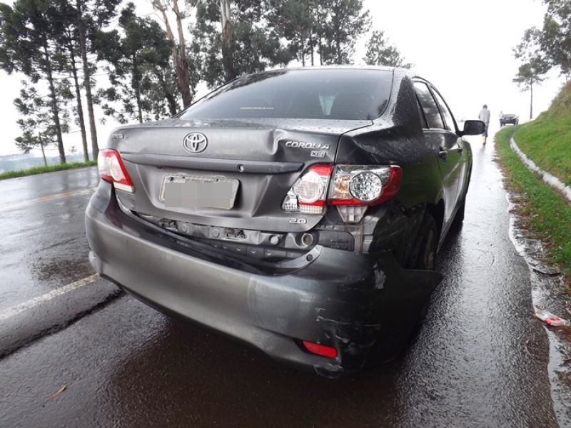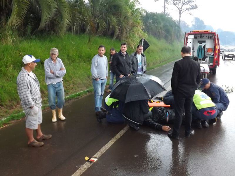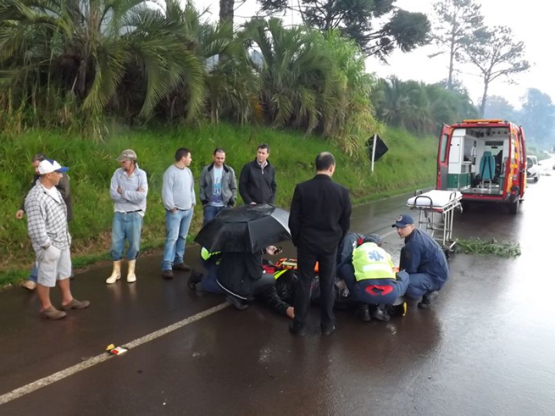21/05/2014 Uma colisão envolvendo moto e dois carros foi registrada na manhã desta quarta-feira na BR-282 em Joaçaba, próximo ao trevo de acesso ao Distrito Industrial. O acidente foi por volta das 9h. A pista estava molhada. Os veículos faziam sentido Catanduvas/Joaçaba. Segundo informações uma caminhonete teria freado repentinamente. Na sequência estava um Toyota Corolla placas de Cunha Porã/SC. Na traseira dele bateu uma moto Honda placa de Concórdia/SC, usada para frete. O condutor de um Logan placas de São José dos Pinhais/PR não conseguiu segurar e arrastou a moto por alguns metros. O motorista do carro do Paraná disse que tentou desviar jogando o carro no barranco, mas não foi possível. O motociclista ficou caído no meio da pista. Ele foi atendido pelo Corpo de Bombeiros. Ele foi imobilizado e conduzido ao Hospital Universitário Santa Terezinha com escoriações e suspeita de fratura na perna esquerda. Os demais envolvidos não se feriram. A Polícia Rodoviária Federal fez o levantamento das informações para tentar apurar as causas do acidente.