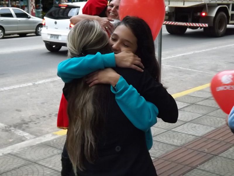22/05/2014 Foi realizado nesta quinta-feira (22) o Dia do Abraço. A Unoesc repetiu a ação que realizou em 2013. Durante a tarde funcionários da universidade e atores estiveram no Centro de Joaçaba distribuindo abraços para as pessoas. A concentração ocorreu na avenida XV de Novembro e na praça Adolfo Konder. A ação aconteceu também durante a manhã e se estendeu à noite dentro da universidade, voltada a alunos, professores e funcionários.