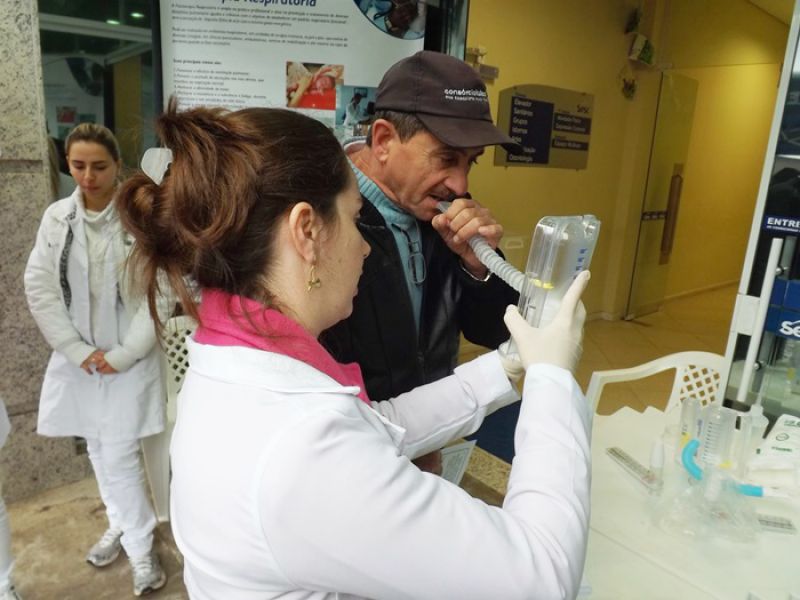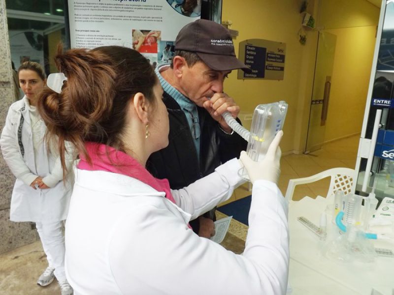 31/05/2014 O Sesc e o curso de Fisioterapia da Unoesc realizaram na manhã deste sábado (31) atividades alusivas ao Dia Mundial sem Tabaco. Nem mesmo a chuva atrapalhou a programação que foi desenvolvida em uma tenda montada em frente ao Sesc. Foram fornecidas orientações, teste de mensuração da capacidade inspiratória, recolhidas carteiras de cigarro através de uma caixa de coleta e distribuição de material informativo sobre os malefícios do cigarro. As pessoas passavam pelo local, faziam o teste e recebiam as orientações gratuitamente. De acordo com a coordenadora do curso de Fisioterapia da Unoesc, Chrystianne Saretto, os problemas respiratórios decorrentes do tabaco e até mesmo da oscilação de temperatura são preocupantes na região de Joaçaba. Ela destaca que o curso tem sido procurado frequentemente para desenvolver parcerias e atividades pedagógicas. A coordenadora de Educação e Saúde do Sesc, Liliana Dagostini, ressalta que mensalmente são feitas ações junto à comunidade. A última foi voltada à Saúde da Mulher e agora as orientações para os fumantes no intuito de minimizar o consumo ou até mesmo estimular as pessoas a pararem de fumar. Ela informa que há um cronograma de atividades previstas relacionadas à área para o mês de junho.