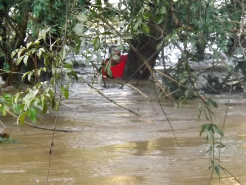 09/06/2014 Um cão da raça São Bernardo pesando 100 quilos foi retirado das águas do Rio do Peixe em Joaçaba depois de ficar cerca de quatro horas ilhado no início da tarde desta segunda-feira (09). O animal de nome Rebeca com dois anos de idade pertence à família de Maurício Grando que reside no bairro Santo Antônio em Herval d' Oeste, em frente ao parque de máquinas da prefeitura. Segundo o proprietário do cão, Rebeca é dócil e tem o hábito de brincar com capivaras que saem do rio e vão pastar no pátio da residência. Porém, nesta segunda depois que as capivaras entraram na água, por volta das 13h30, a cadela foi atrás, mas devido ao nível elevado do rio e à forte correnteza acabou sendo arrastada pela água. Rebeca foi parar numa distância aproximada em linha reta de dois quilômetros, nos fundos da AABB em Joaçaba. Rebeca ficou presa em galhos de uma ilha e começou a latir, chamando a atenção de populares que acionaram o Corpo de Bombeiros. Dois mergulhadores foram ao local pela rua Roberto Trompowski. O dono e a mulher dele acompanharam o resgate. Os bombeiros nadaram até o animal usando coletes salva-vidas e cordas. A forte correnteza e o peso do animal dificultaram a ação de salvamento e levaram cerca de uma hora para retirar Rebeca da água, por volta das 17h. Ela estava apenas cansada, mas sem ferimentos.