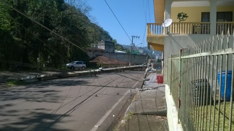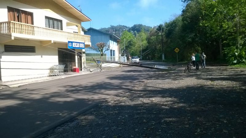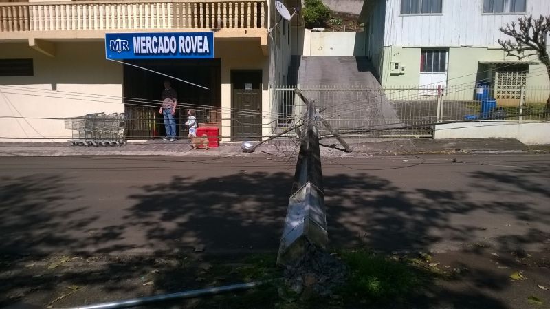 01/09/2014 Uma manobra mal sucedida de um caminhão com placas de Curitibanos deixou parte dos moradores da rua Eliziário de Carli sem energia na manhã desta segunda-feira (01). O caminhão que estava fazendo entrega de mercadorias a estabelecimentos comerciais atingiu um poste de energia da CELESC por volta das 10hs, derrubando o mesmo. O motorista informou que não viu o poste. Os pedestres e moradores vizinhos escutaram um forte estrondo e viram muitas faíscas saindo dos cabos de alta tensão. Apesar da queda do poste, ninguém ficou ferido. Parte da rua, entre o Colégio Frei Bruno e o BAR 636, ficou sem energia.