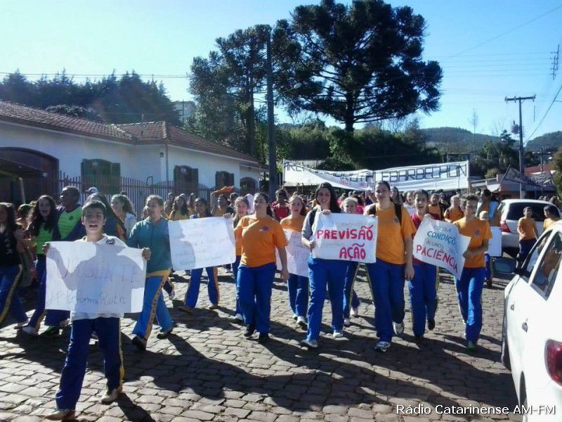Cansados de esperar por uma solução para este caso, em torno de 150 alunos se mobilizaram e fizeram uma passeata na área central de Água Doce na manhã desta segunda-feira (8). Nos cartazes e faixas os alunos levaram ao conhecimento de todos a situação em que se encontra a escola estadual Ruth Lebarbechon. “A cada dia de chuva forte corremos risco se ficarmos dentro da sala de aula e do colégio”, ressaltou uma aluna.