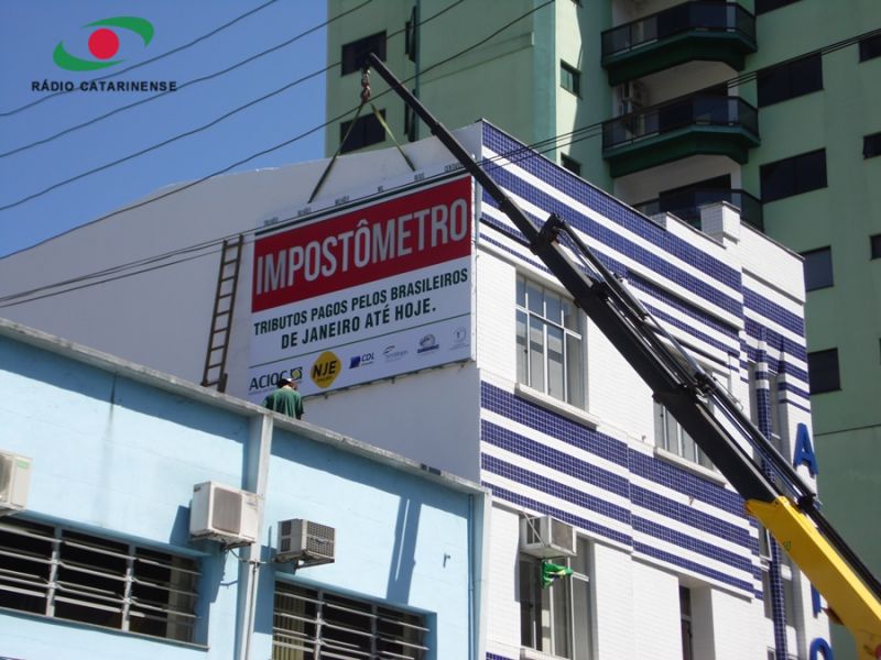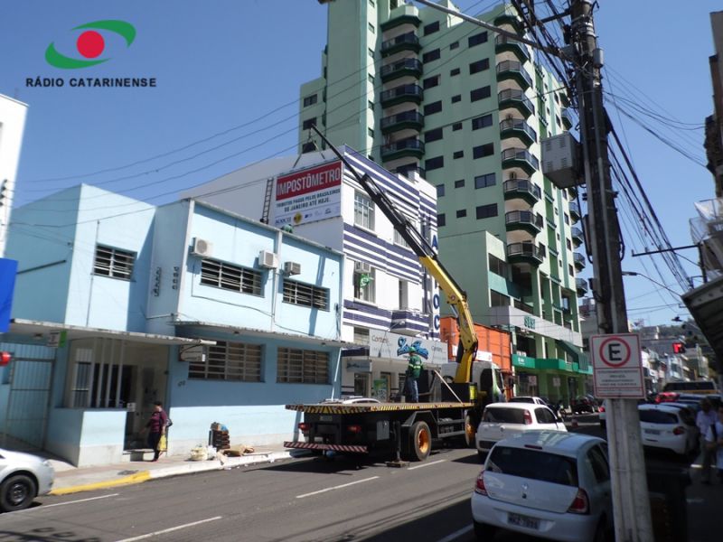 10/09/2014 Um guincho na manhã desta quarta-feira (10), no calçadão da Getúlio Vargas, no centro de Joaçaba, chamou atenção dos pedestres e motoristas. O equipamento foi utilizado pela Associação Comercial e Industrial do Oeste Catarinense (ACIO) para afixar na parede lateral do prédio da associação o Impostômetro. O painel, que custou cerca de R$ 12 mil, será inaugurado no próximo sábado, dia 13.