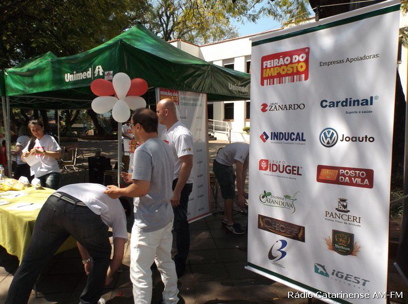 13/09/2014 Na manhã deste sábado (13) foi realizado o Feirão do Imposto defronte a Prefeitura Municipal de Joaçaba. O evento foi coordenado pelo Núcleo dos Jovens Empreendedores da Associação Comercial e Industrial do Oeste Catarinense (ACIOC). Na oportunidade os organizadores mostraram as pessoas que trafegavam pelo local, a carga tributária que incide sobre a folha de pagamento dos trabalhadores, bem como, o valor do imposto sobre alguns produtores que foram colocados à mostra.