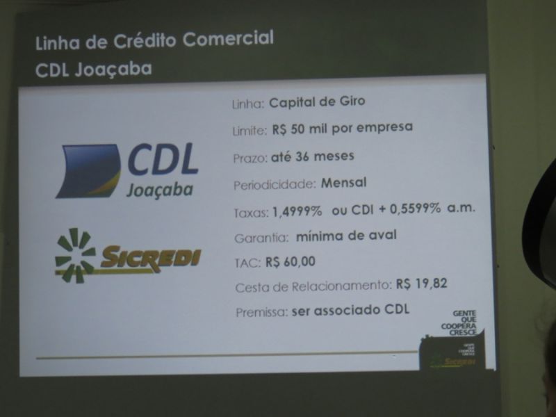 A linha especial de empréstimo é destinada a capital de giro. Associados da CDL, em dia com as mensalidades e obrigações, terão acesso a um valor de até R$ 50 mil com prazo de 36 meses para pagamento e com taxa diferenciada de juros de 1,49% ao mês ou CDI+0,55%. O diretor de negócios do Sicredi Norte RS/SC, Adriano Dagostini, veio especialmente à Joaçaba assinar o convênio em conjunto com Roque Cazagranda, gerente da unidade de atendimento. O diretor financeiro da CDL, Marcelo Risson, fez questão de destacar em seu pronunciamento que a maior satisfação com o convênio é proporcionar a possibilidade de bom negócio para o associado que, caso necessite, terá uma linha de crédito especial com taxa de juro diferenciada.