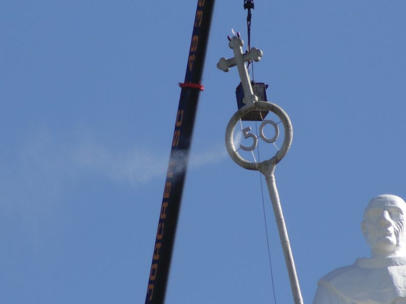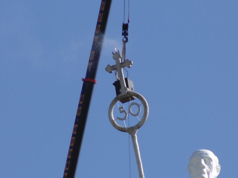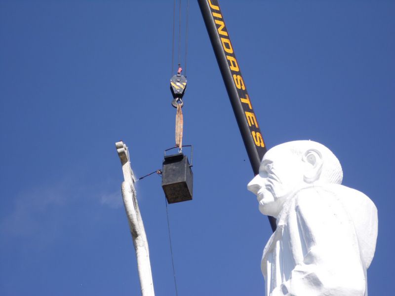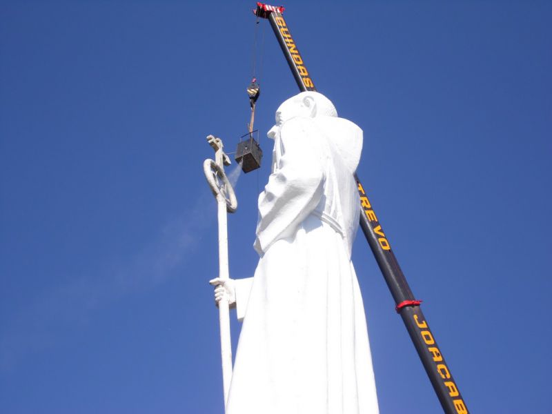27/10/2014 A empresa contratada pela Câmara de Dirigentes Lojistas de Joaçaba (CDL) iniciou na manhã desta segunda-feira (27) uma das tarefas mais difíceis da obra de revitalização do Monumento Frei Bruno. Com auxílio de um guindaste de grande porte a empresa teve acesso e está executando a limpeza do Cajado, tarefa que deverá ser finalizada até o final da tarde. O diretor de serviços da CDL, Sérgio Bucco, explicou que ainda esta semana será aplicada mais uma demão de tinta na rampa de acesso. A última etapa será a implantação de um moderno sistema de iluminação que vai garantir uma melhor visibilidade da estátua. Na última sexta-feira (24) representantes de uma empresa especializada de SP estiveram em Joaçaba realizando alguns testes para se definir o tipo de equipamento que será usado. Se tudo correr conforme o programado a obra deverá ser finalizada até a segunda quinzena de novembro.