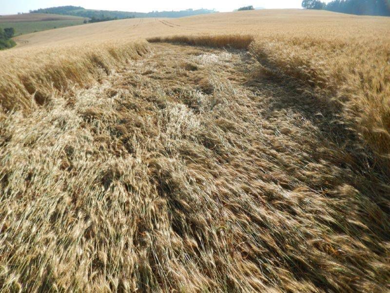 Pelo sétimo ano consecutivo, o fenômeno se repete em Ipuaçu, deixando absolutamente clara sua natureza não humana e inteligente. Eles surgiram de novo, mais uma vez em dupla e na época habitual: últimos dias de outubro, primeiros dias de novembro. O local onde foram encontrados os dois primeiros agroglifos de 2014, nesta manhã de domingo, 26 de outubro, por volta das 07h30, é o topo de um morrote que fica na propriedade do senhor Ângelo Aléssio. Sua fazenda já havia sido palco de agroglifos em anos anteriores. Neste ano, ela era uma das poucas em que o trigo ainda não havia sido colhido, como ocorreu com a maioria das propriedades ao redor.