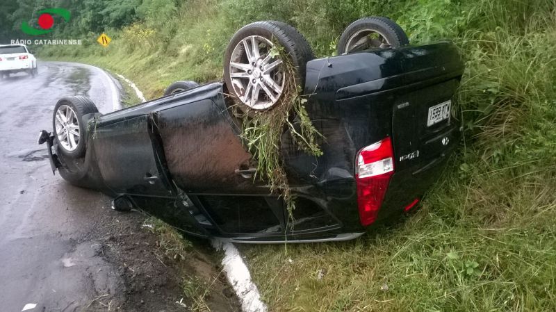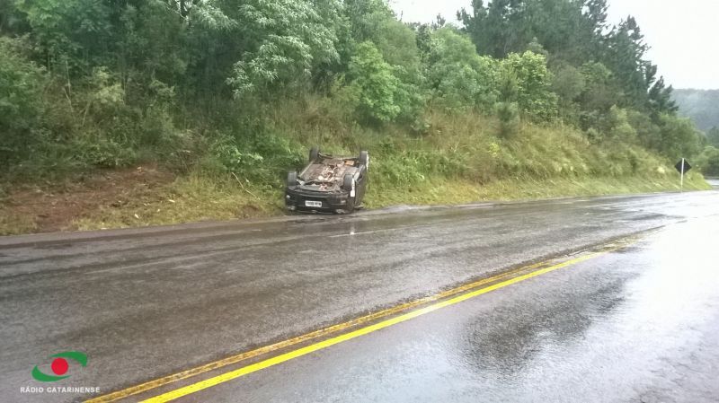 04/11/2014 Um casal de Joaçaba que se deslocava pela BR-282 na manhã desta terça-feira (04) levou um grande susto. O motorista de 24 anos perdeu o controle e o Hyundai i30, com placas de Joaçaba, saiu da pista bateu contra um barranco e em seguida capotou ficando com o rodado para cima. O acidente aconteceu por volta das 09h30 em Catanduvas numa curva em frente a uma Ervateira. O casal sofreu apenas ferimentos leves e o veículo ficou praticamente destruído. Chovia na hora do acidente. O veículo estava se deslocando sentido Joaçaba/Chapecó. Viajava junto com o motorista uma jovem de 24 anos.