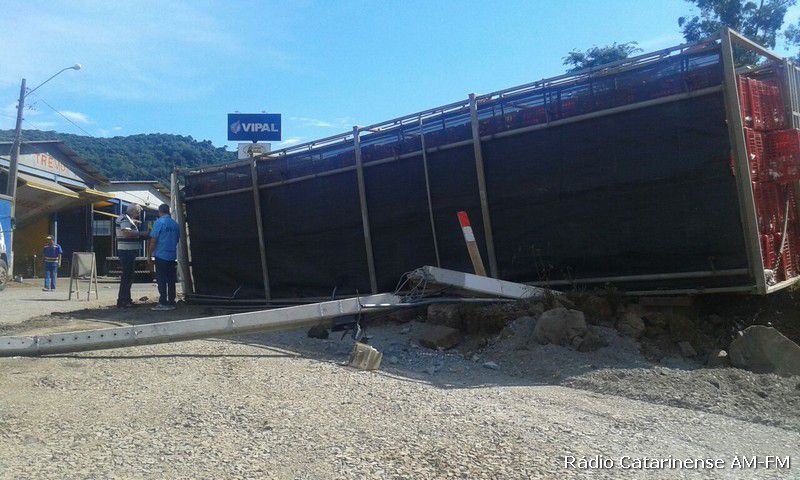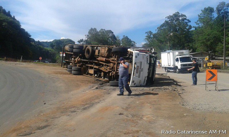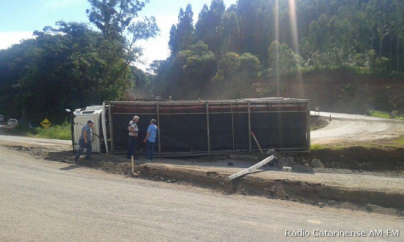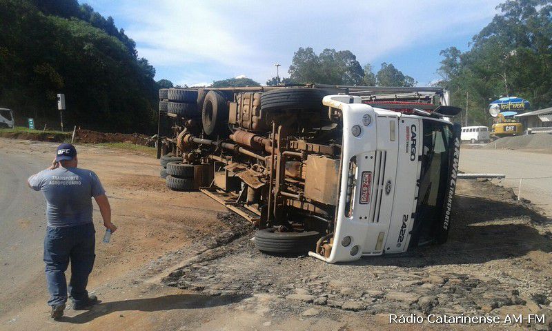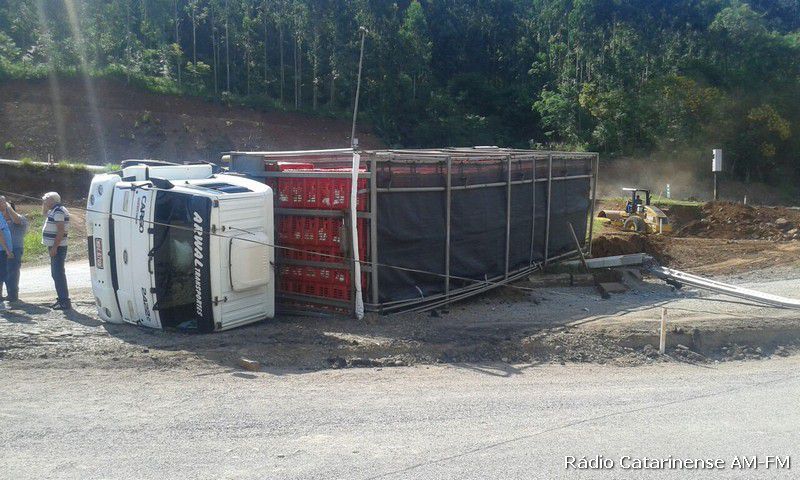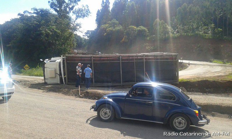 02/02/2015 Por volta das 16h30 desta segunda-feira (02), um caminhão Ford Cargo graneleiro com placas MDZ-6709 de Joaçaba, tombou no trevo do Chocodinho, quando o motorista Dieison Kosenhoski de 26 anos, fazia uma curva com destino ao município de Capinzal, onde levaria a carga de frangos.