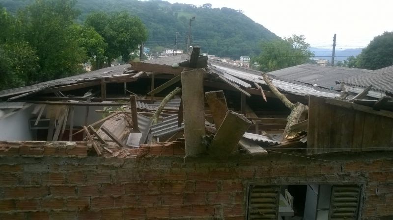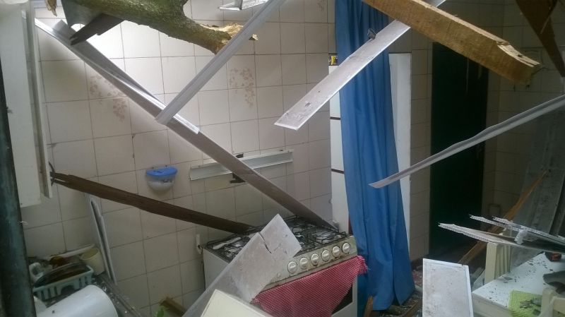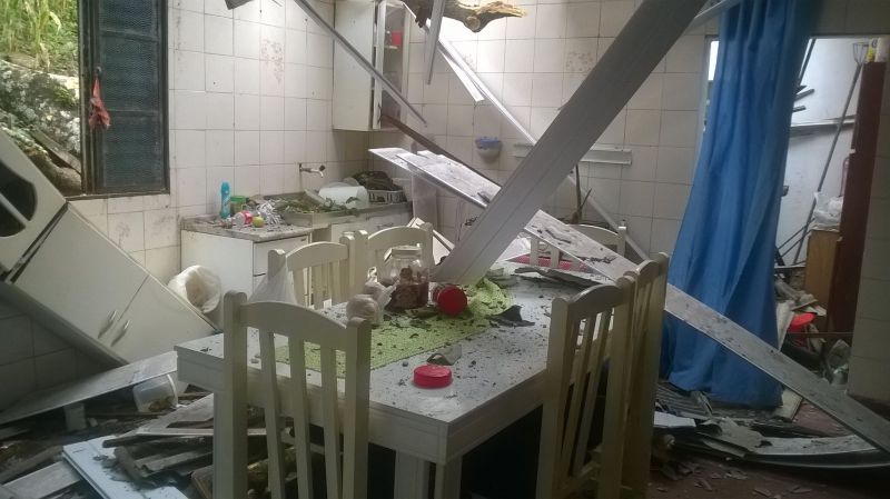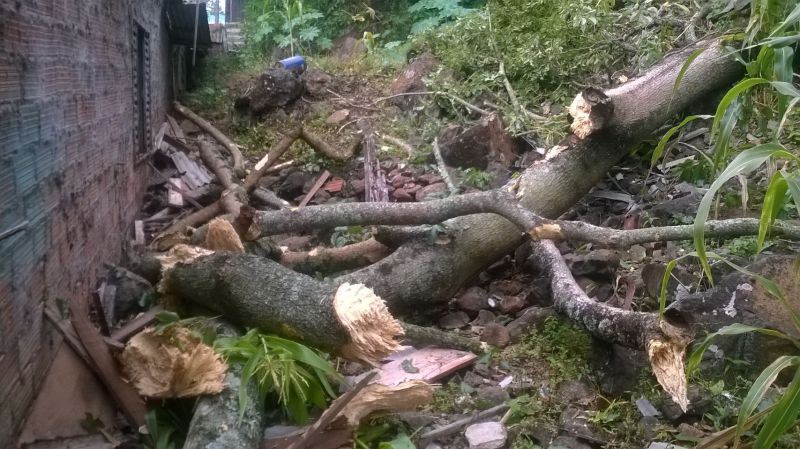 06/02/2015 feira (06). A casa onde mora Matilde Casado foi atingida por uma árvore de grande porte. Os galhos danificaram a parede, o telhado e o forro. Os entulhos gerados pelo impacto atingiram até mesmo os móveis da cozinha. O incidente aconteceu por volta das 09hs na rua Luiz Paulino e ninguém ficou ferido. O Corpo de Bombeiros esteve no local e realizou o trabalho fotográfico.