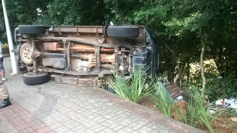 09/02/2015 Uma camionete Mitsubishi L200 Triton tombou na avenida XV de Novembro em Joaçaba no início da manhã desta segunda-feira (09). O acidente aconteceu no trecho entre a passarela Atílio Pagnoncélli e a ponte Jorge Lacerda. O veículo com placas de Joaçaba invadiu a calçada, arrancou uma lixeira e tombou. Ninguém ficou ferido nesta saída de pista. O motorista, de 19 anos, que estava se deslocando para trabalhar em Herval d’Oeste, disse que não sabe o que aconteceu, afirmando que estava transitando com velocidade compatível para o local. Por muito pouco ele não caiu no Rio do Peixe. Uma árvore evitou uma tragédia maior.