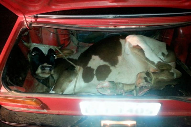 17/02/2015 Um boi foi encontrado amarrado dentro do porta-malas de um carro na noite desta segunda-feira (16) na BR-386 em Lajeado, no Vale do Taquari, Rio Grande do Sul. Segundo a Polícia Rodoviária Federal (PRF), o motorista e um passageiro do carro, um Chevette, foram autuados por transporte irregular e liberados, mas o animal ficou à disposição do Comando Ambiental da Brigada Militar.