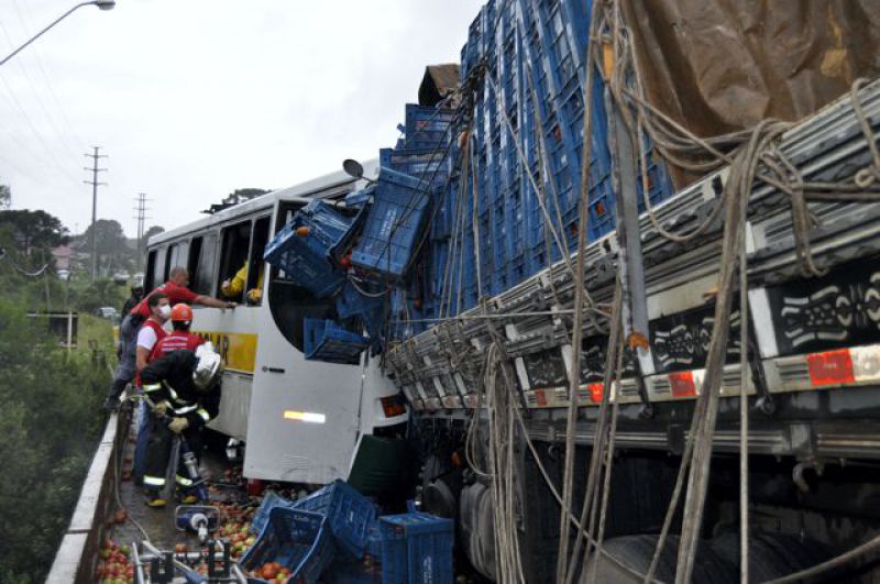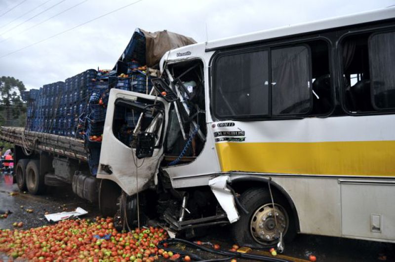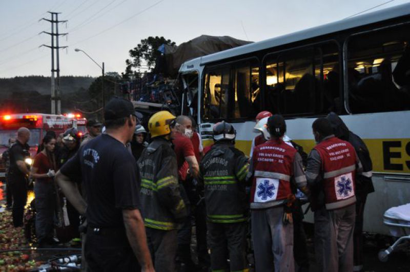 19/02/2015 Um acidente grave movimenta polícia e bombeiros no final da tarde e início de noite desta quinta-feira, 19, em Caçador. Por volta das 18h40, um ônibus escolar de Santa Cecília colidiu frontalmente com um caminhão com placas de Vila Velha (ES) carregado de tomate, na ponte do Castelhano, na SC 350. Chovia bastante no momento do acidente. O coletivo transportava cerca de 40 alunos de Santa Cecília para a Uniarp, em Caçador. Os bombeiros voluntários de Caçador confirmaram dois óbitos, o motorista do ônibus e do caminhão. Há várias pessoas feridas, inclusive estudantes que ficaram presos nas ferragens. As vítimas foram conduzidas ao hospital Maicé. Duas jovens que estavam nos primeiros bancos ficaram feridas com mais gravidade.