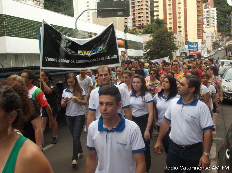 27/02/2015 Durante um pouco mais de uma hora, o comércio de Joaçaba se aliou e abraçou a reivindicação dos caminhoneiros que estão paralisados em várias regiões do país e em Santa Catarina, pedindo ao governo federal a diminuição no valor do diesel e melhores estradas.