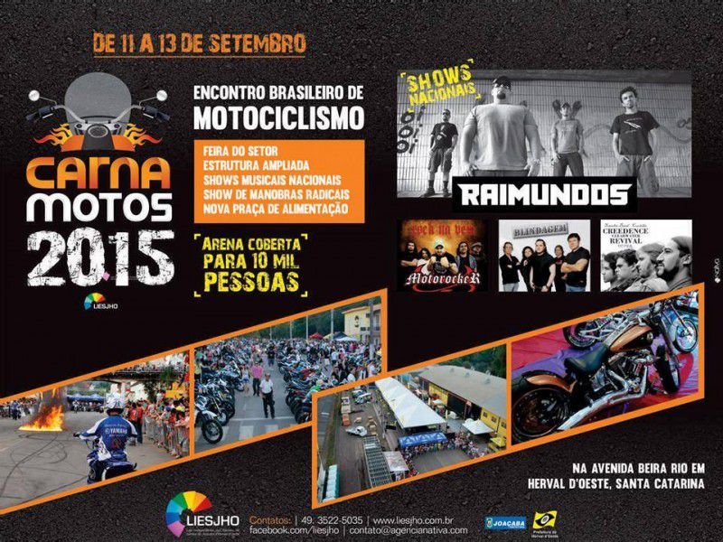 09/05/2015 Nos próximos dias – data a ser anunciada – inicia a venda do primeiro lote de ingressos para a segunda edição do CarnaMotos – Encontro Brasileiro de Motociclistas - evento a ser realizado nos dias 11, 12 e 13 de setembro de 2015 na Avenida Beira Rio e Centro de Eventos da Unidos da Herval – na cidade de Herval d´Oeste.