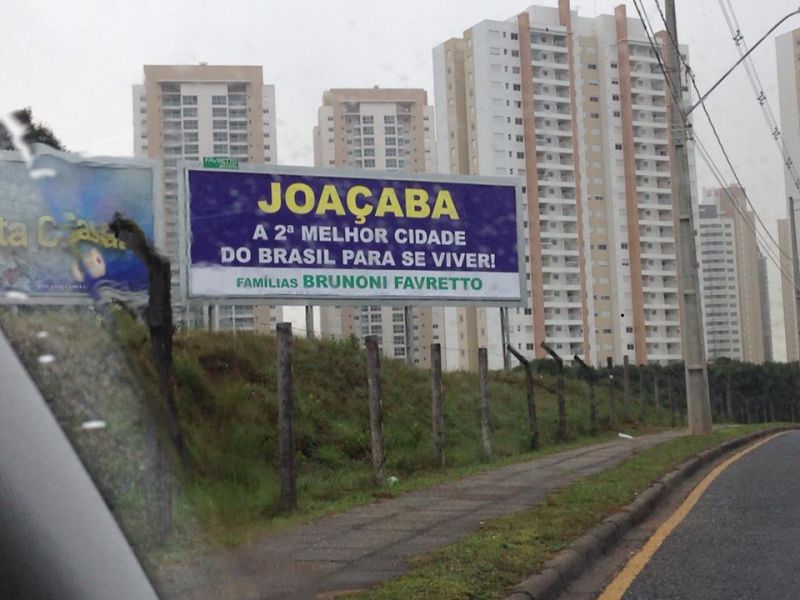 20/05/2015 Um outdoor em Curitiba tem colaborado para divulgar a cidade de Joaçaba. Na placa publicitária, que mede sete metros de largura por três de altura, o proprietário fez questão de salientar o nome de Joaçaba em letras bem visíveis e informar que é a 2º melhor cidade do Brasil em se tratando de qualidade de vida. A referência se deve a última pesquisa divulgada. O outdoor leva o nome das famílias Brunoni Favreto. Ele foi idealizado por Jorge Favreto, um morador de Nova Petrópolis que saiu de Joaçaba em 1971. O outdor que ilustra esta matéria está localizado na rua Ivo Zanlorenzi, próximo a Universidade Positivo.
