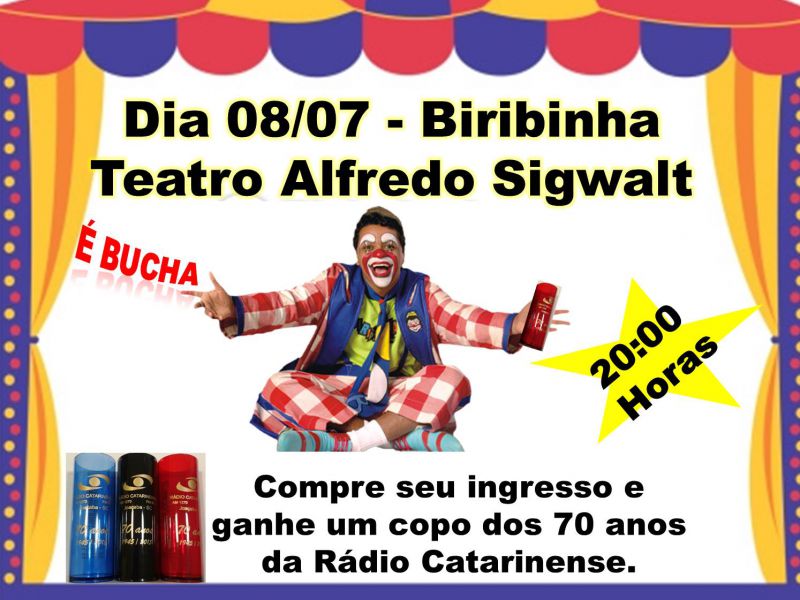 29/06/2015 Bordões como É Bucha! Mas é o Nenhonho! vão voltar a ser ouvidos em Joaçaba. Depois de dois anos, o Teatro Biribinha retorna ao palco do teatro Alfredo Sigwalt para alegria da criançada e também dos adultos que gostam de uma boa dose de humor. O espetáculo vai acontecer no próximo dia 08 com início às 20hs. Os ingressos começam ser vendidos na secretaria do teatro a partir desta terça-feira (30). Birinha, sucesso de público por onde passa, promete encantar e divertir o público com muita criatividade e humor inteligente.Quem adquirir ingresso vai ganhar um copo personalizado da Rádio Catarinense, alusivo aos 70 anos da emissora (copo abaixo)