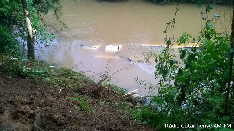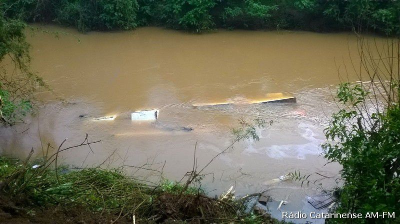 08/07/2015 Por volta das 17h desta quarta-feira (8), um caminhão que realizava reparos na energia elétrica da rua Itororó no bairro Nossa Senhora Aparecida em Herval d´Oeste, acabou derrapando e caindo nas águas do Rio Barra Verde. Na oportunidade quatro pessoas estavam no veículo e conseguiram sair a tempo, antes do caminhão afundar totalmente.