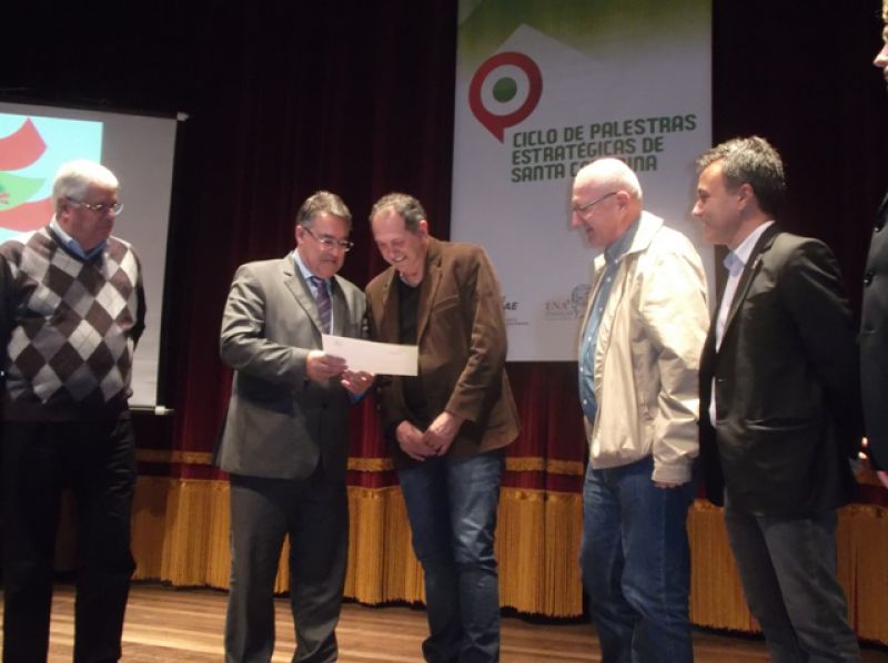 O empresário Sérgio Parizotto que participou de todo o Ciclo de Palestras Estratégicas em Joaçaba recebeu das mãos do governador Raimundo Colombo, do secretário Ricardo Grando da SDR local e de outras autoridades, o Certificado de participação deste evento.