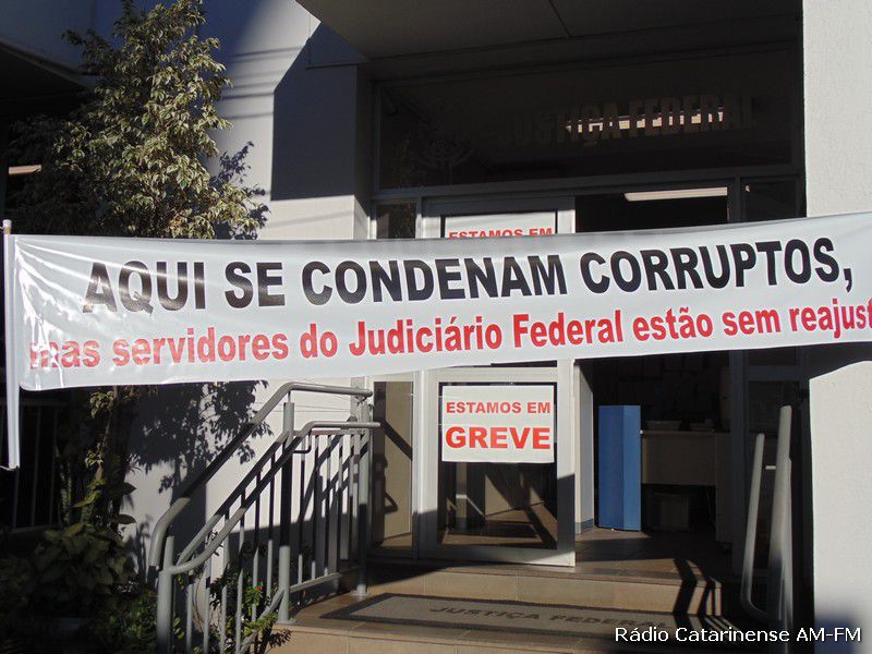 29/07/2015 Parados desde o dia 8 de junho em vários municípios de Santa Catarina, os funcionários da Justiça Federal continuam reivindicando a presidente Dilma Rousseff que sancione o Projeto de Lei que prevê a revisão dos salários da categoria. Os representantes da categoria afirmam que as perdas são significantes e ultrapassa os 54%, levando-se em consideração os últimos 9 anos.