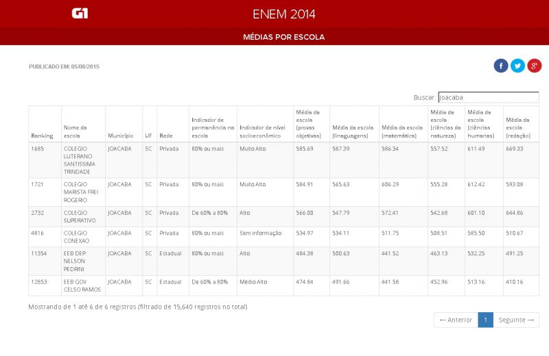 05/08/2015 O Instituto Nacional de Estudos e Pesquisas Educacionais Anísio Teixeira (Inep) divulgou na manhã desta quarta-feira (5) as notas por escola da edição do ano passado do Exame Nacional do Ensino Médio (Enem 2014). Os dados abrangem 15.640 escolas de todo o país. Nelas, 1.295.954 estudantes fizeram o Enem. A divulgação dos dados de 2014 marca o terceiro ano consecutivo em que o governo federal não divulga a média geral do Enem por escola, e apresenta apenas a média em cada uma das quatro provas objetivas e da prova de redação. O objetivo é diminuir o impacto da comparação direta entre as instituições de ensino.